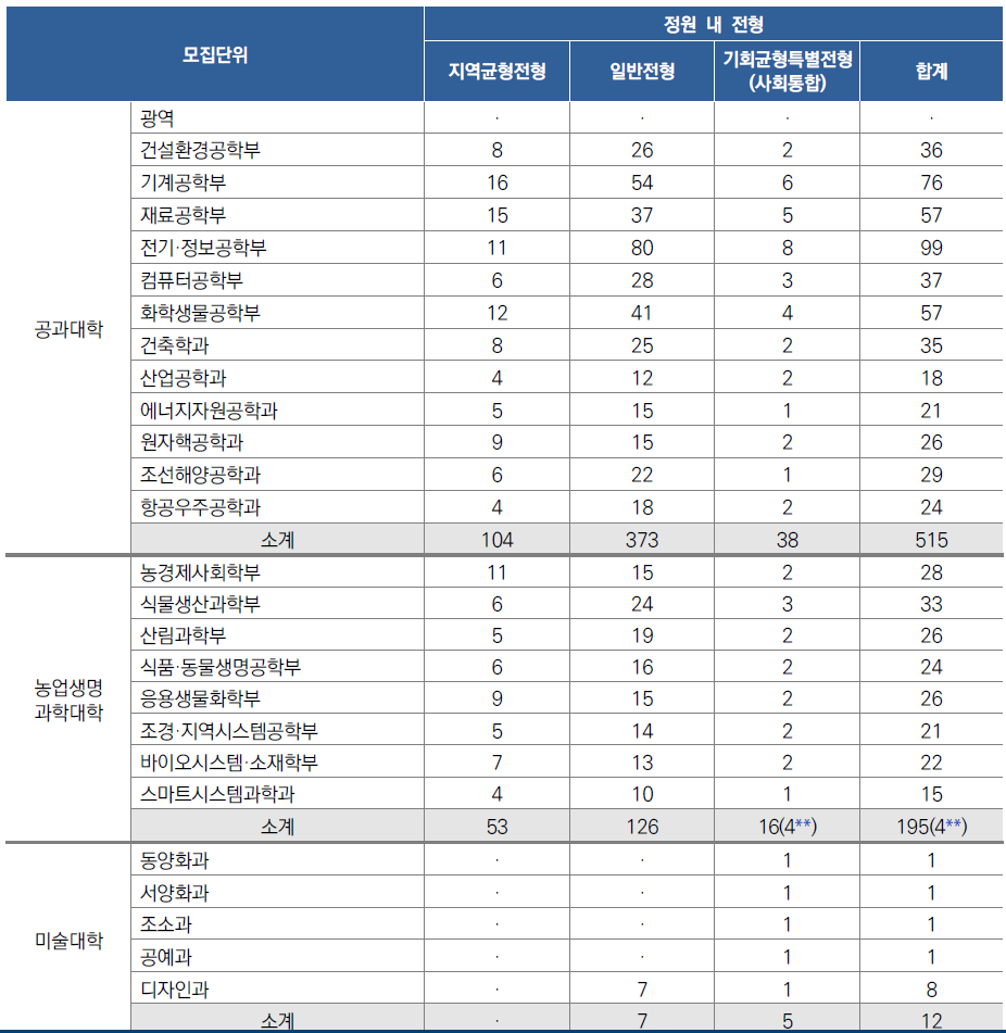 | 식물생산과학부, 산림과학부, 응용생물화학부, 식품·동물생명공학부, 바이오시스템·소재학부, 조경·지역시스템공학부 | 2,975,000 | |