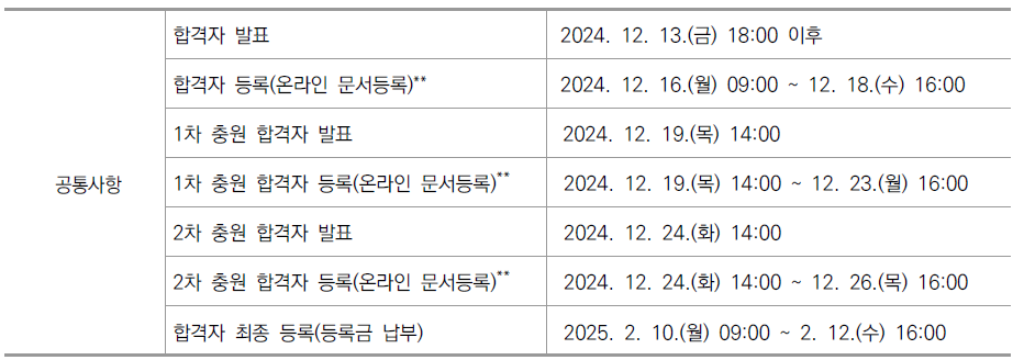 | 합격자 등록(온라인 문서등록) | 2024. 12. 16.(월) 09:00 ~ 12. 18.(수) 16:00 |