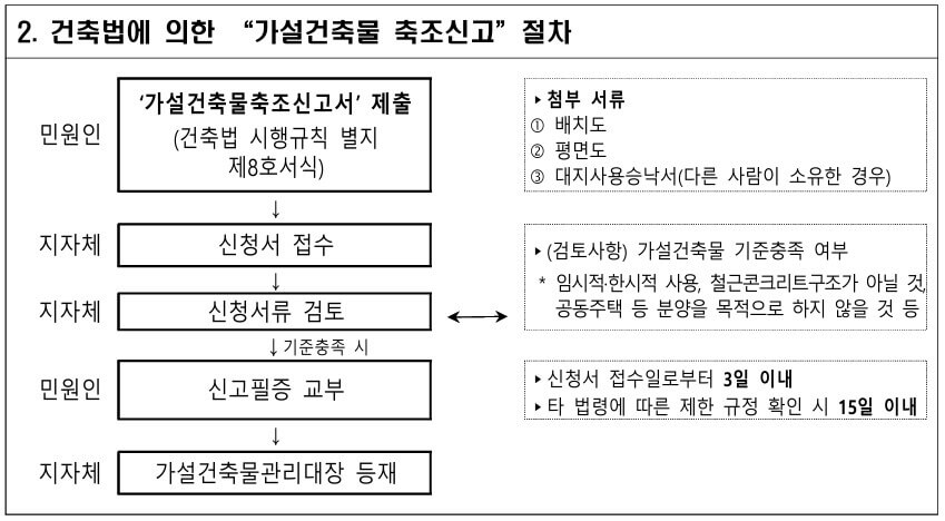 ○ 농지 소재지 관할 시·구·읍·면장에게 「농지법 시행규칙」별지 제58호의 3 쉼터 설치 및 이용계획 신고서 제출, 지자체 시설 입지 및 안전기준 확인 후 「건축법」에 의한 가설건축물 축조 신고 또는 건축신고