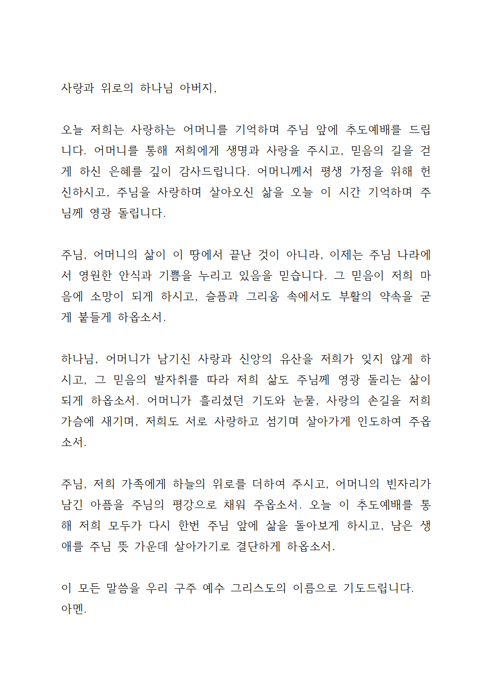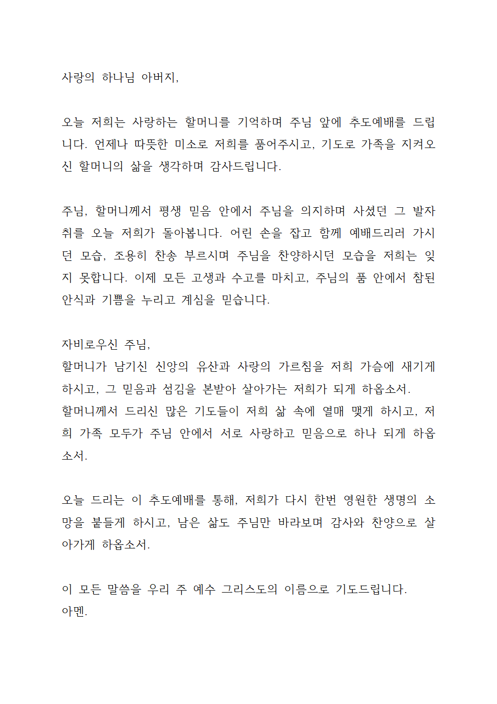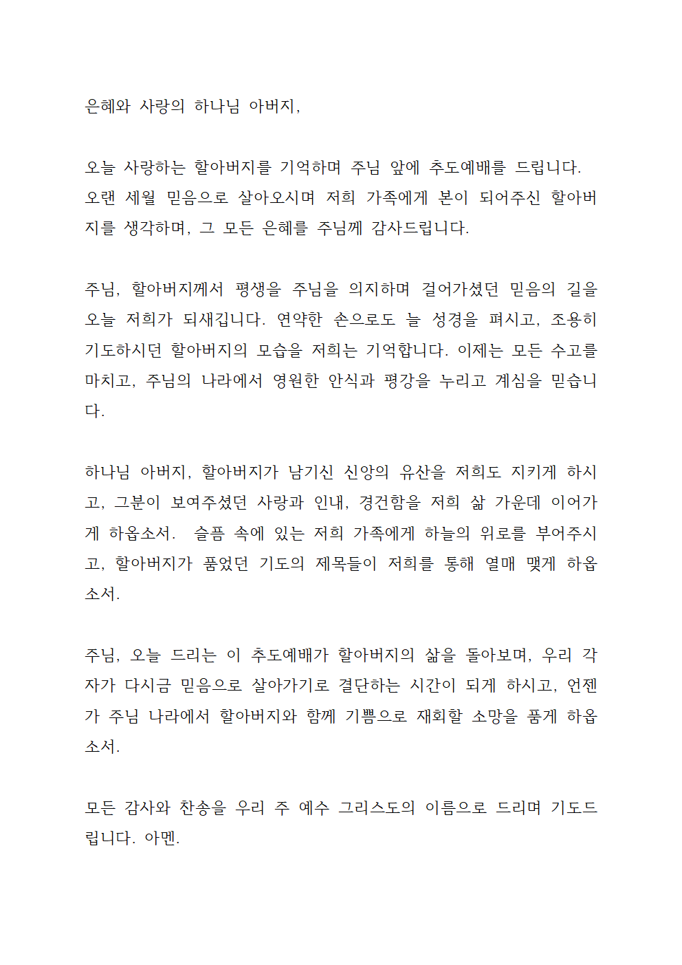 주님, 오늘 드리는 이 추도예배가 할아버지의 삶을 돌아보며, 우리 각자가 다시금 믿음으로 살아가기로 결단하는 시간이 되게 하시고, 언젠가 주님 나라에서 할아버지와 함께 기쁨으로 재회할 소망을 품게 하옵소서.