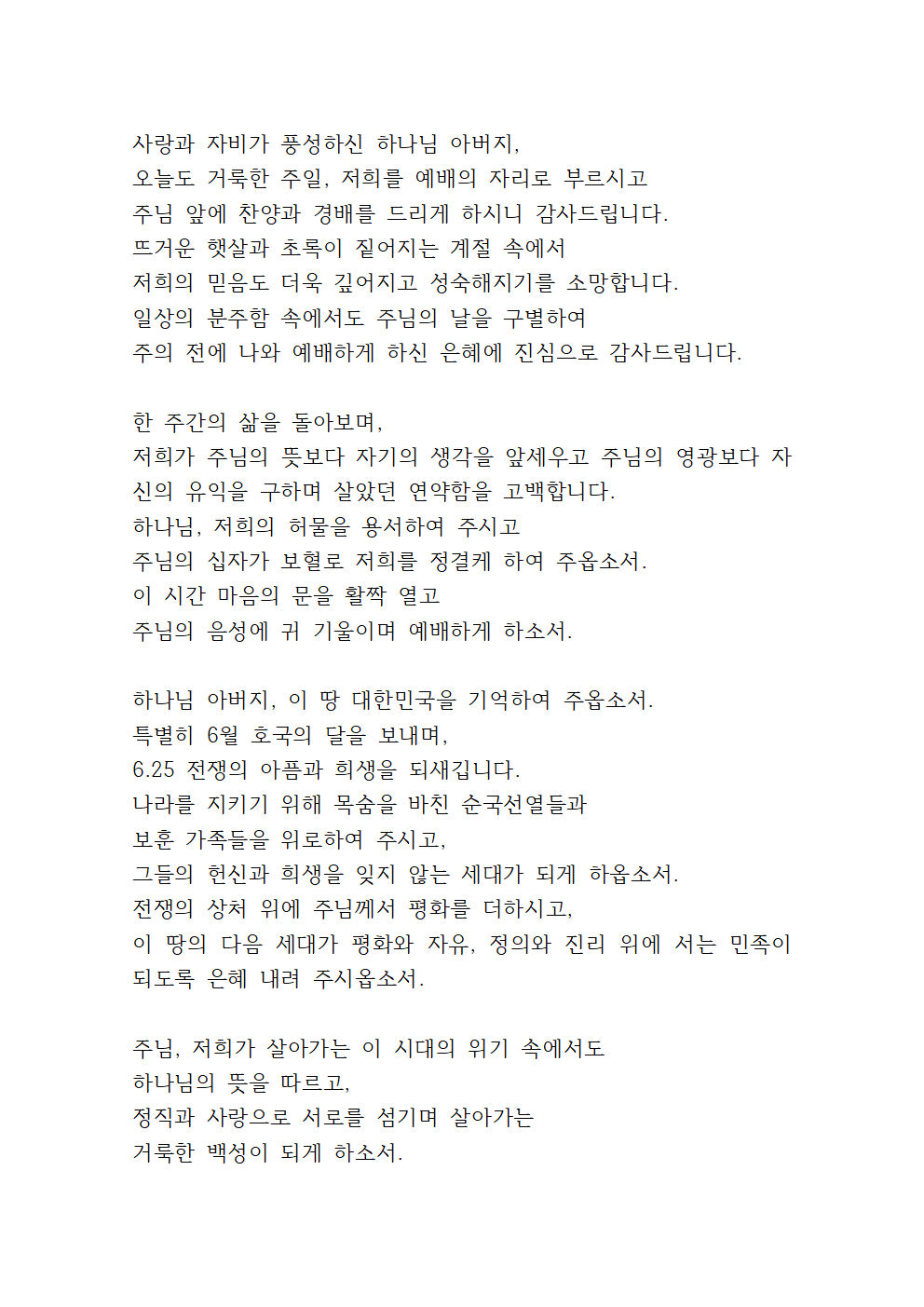 이번 글에서는 2025년 6월 넷째 주일 대표기도문을 안내해 드리겠습니다.