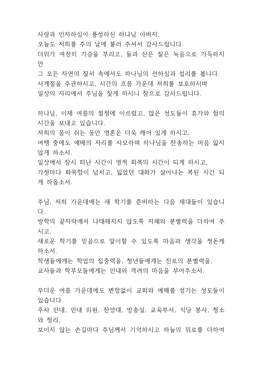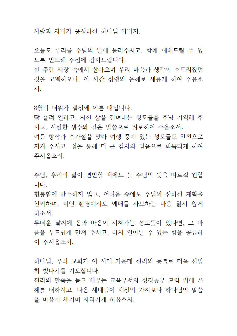 8월 둘째 주 수요예배 기도문