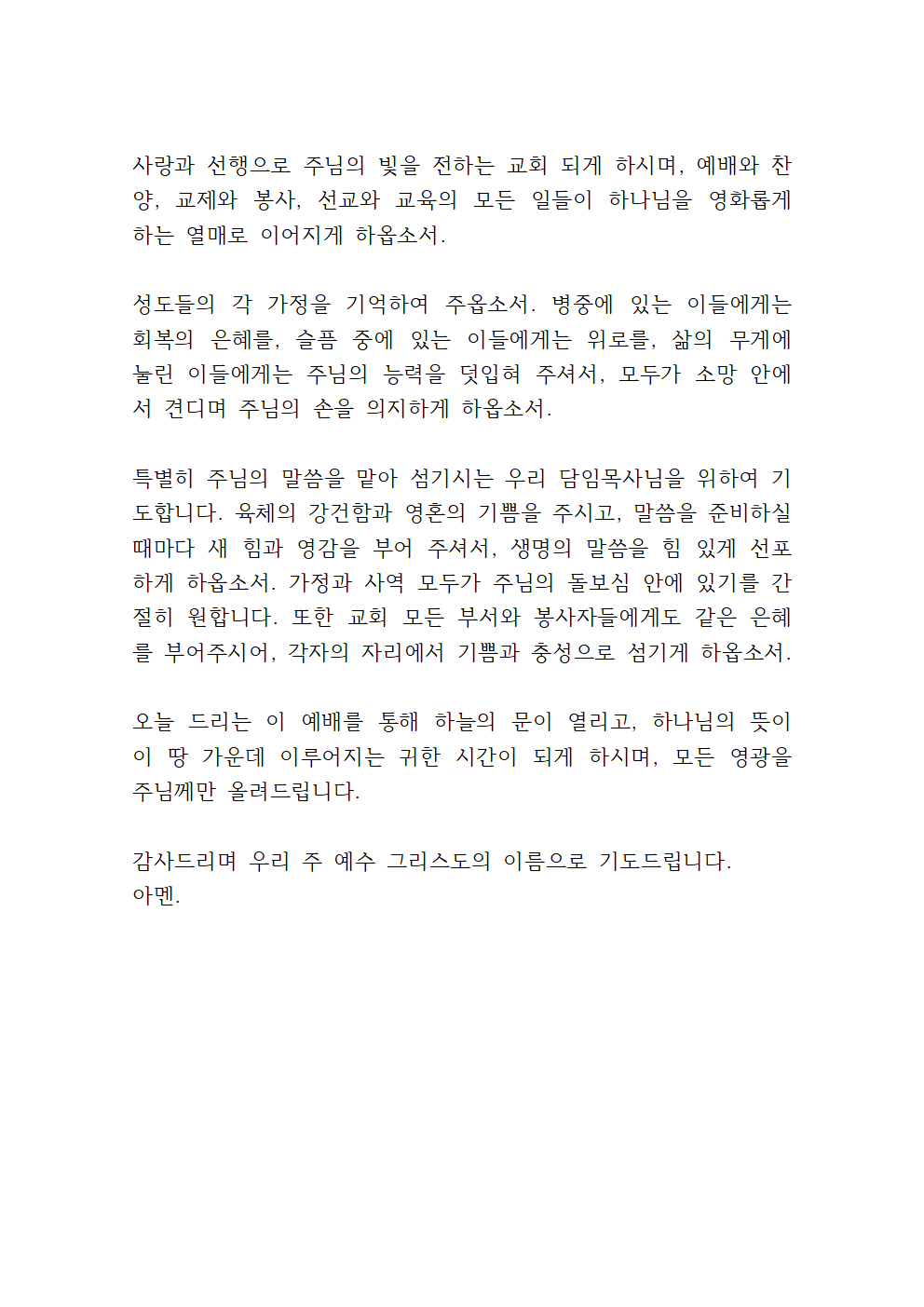 특별히 주님의 말씀을 맡아 섬기시는 우리 담임목사님을 위하여 기도합니다. 육체의 강건함과 영혼의 기쁨을 주시고, 말씀을 준비하실 때마다 새 힘과 영감을 부어 주셔서, 생명의 말씀을 힘 있게 선포하게 하옵소서. 가정과 사역 모두가 주님의 돌보심 안에 있기를 간절히 원합니다. 또한 교회 모든 부서와 봉사자들에게도 같은 은혜를 부어주시어, 각자의 자리에서 기쁨과 충성으로 섬기게 하옵소서.