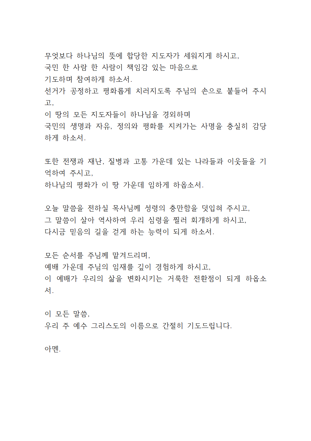 그리고 이틀 후면 우리나라의 새 대통령을 뽑는 대선이 치러지니 대선을 위한 기도, 우리나라를 위한 기도도 포함한다면 더욱 좋겠지요.