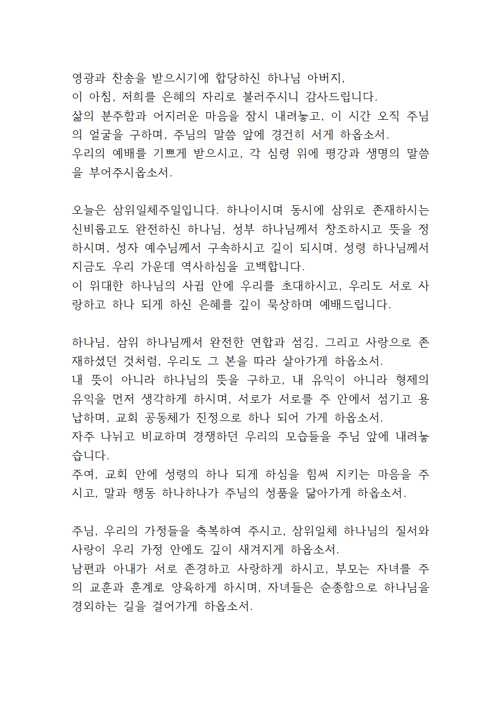 6월 셋째 주일 아침, 저희를 주님의 전으로 불러주시고 주의 백성으로 예배의 자리에 세워주시니 감사드립니다. 하나님의 창조 질서 속에서 계절이 아름답게 흐르고 만물이 제자리를 지키는 가운데, 저희도 신앙의 자리를 지켜 주님을 예배하게 하시니 이 모든 것이 주님의 은혜임을 고백합니다.
