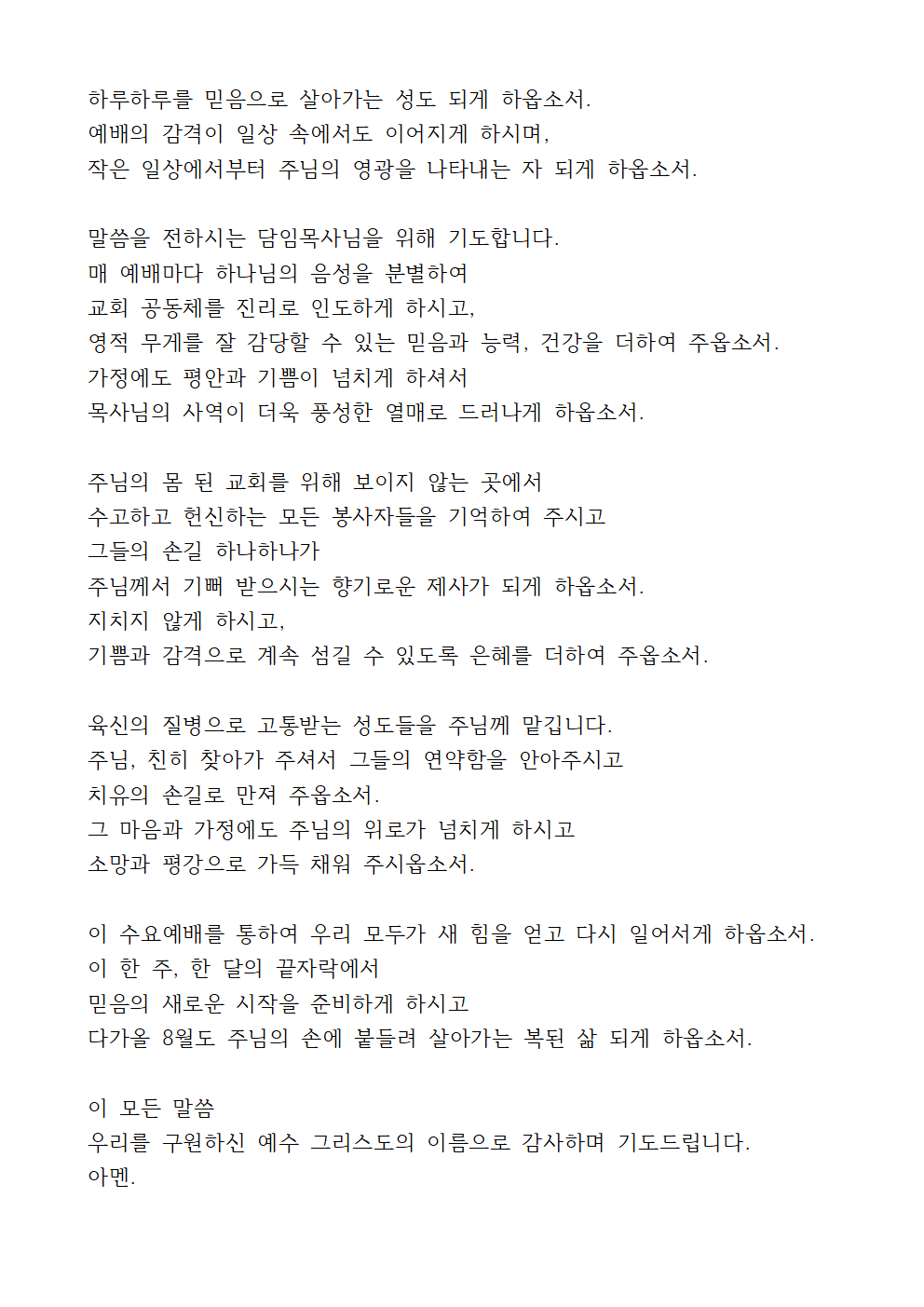 7월 다섯째주 수요예배 대표기도문 (hwp 파일)