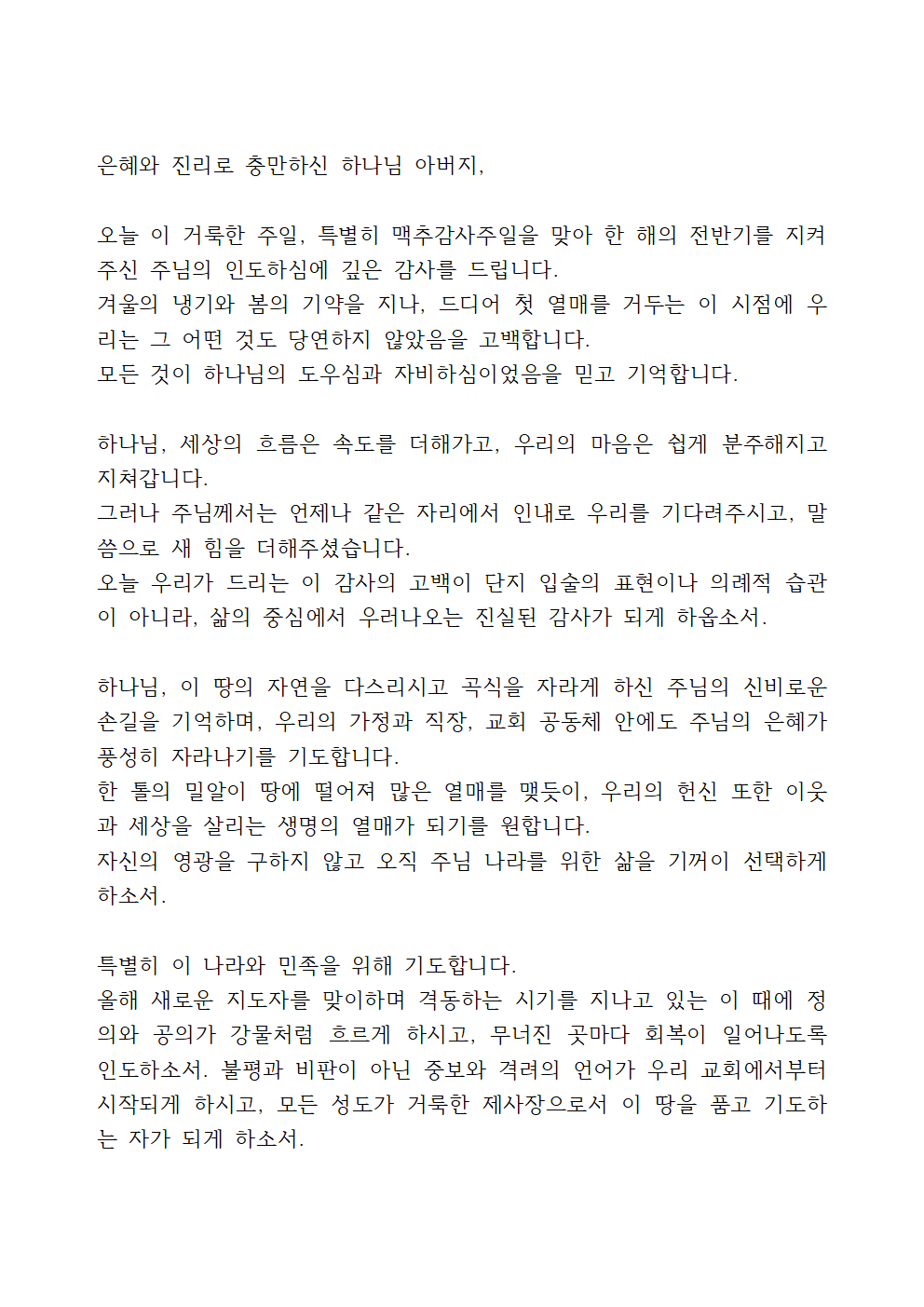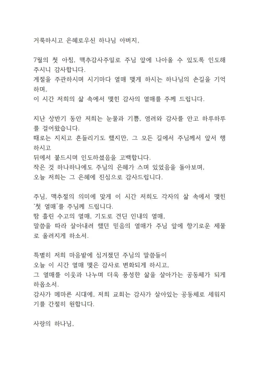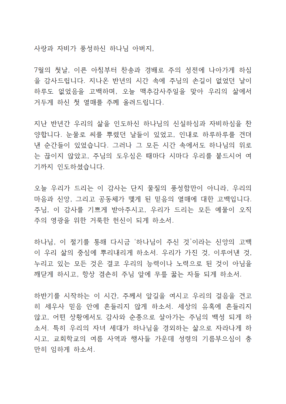 이번 기도문에서는 7월의 첫 주일 맥추감사주일을 맞아, 우리에게 상반기 동안 베푸신 하나님의 은혜를 기억하고 감사를 고백하면 좋을 것 같습니다.