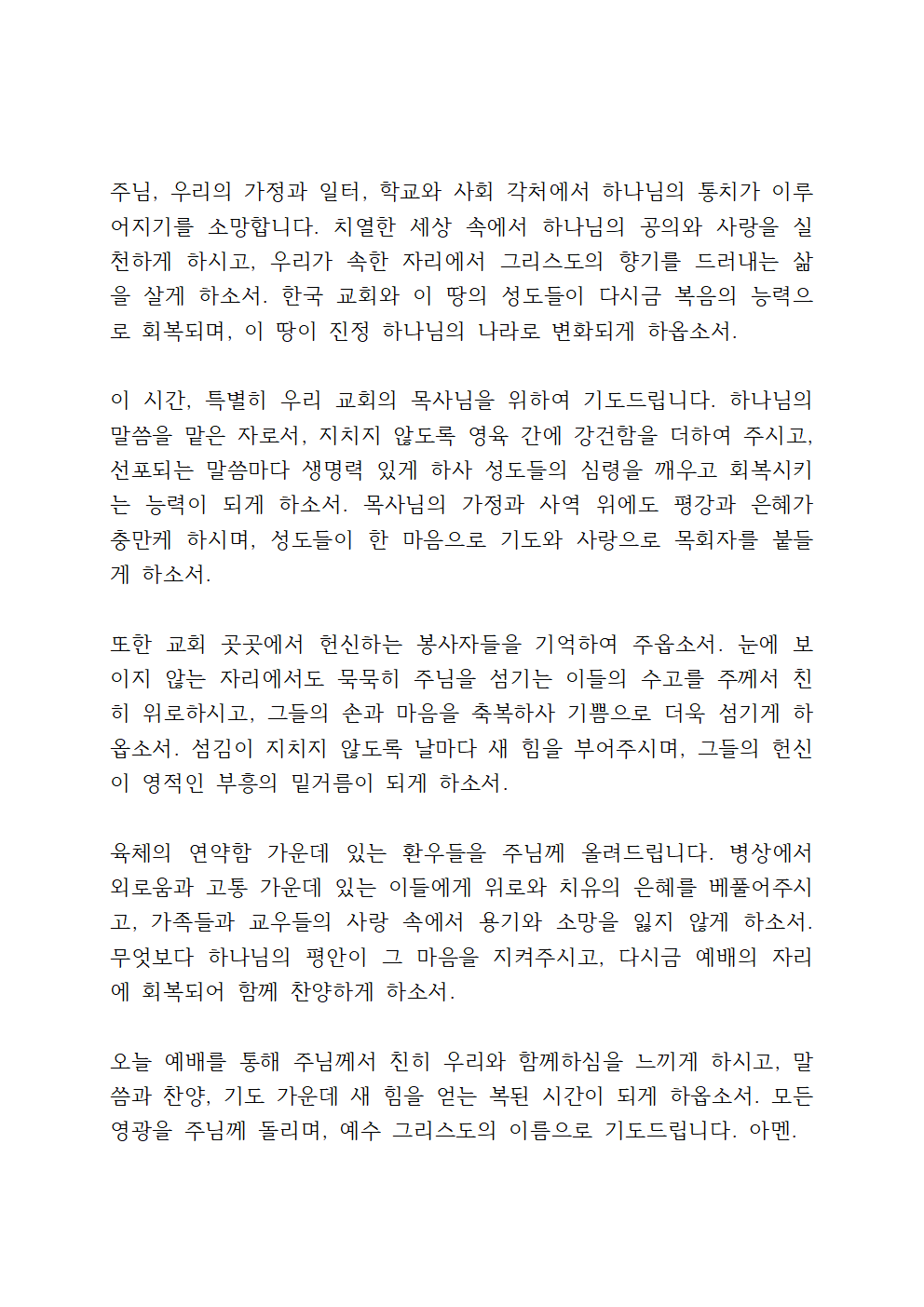 오늘 예배를 통해 주님께서 친히 우리와 함께하심을 느끼게 하시고, 말씀과 찬양, 기도 가운데 새 힘을 얻는 복된 시간이 되게 하옵소서. 모든 영광을 주님께 돌리며, 예수 그리스도의 이름으로 기도드립니다. 아멘.