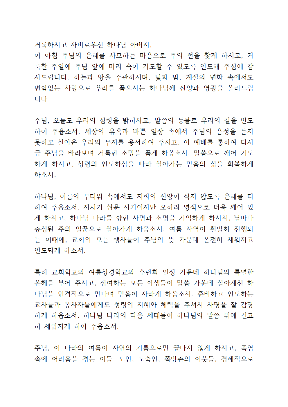 주님, 이 나라의 여름이 자연의 기쁨으로만 끝나지 않게 하시고, 폭염 속에 어려움을 겪는 이들—노인, 노숙인, 쪽방촌의 이웃들, 경제적으로 어려운 가정들—을 주님의 긍휼로 보호하여 주옵소서. 정부와 지자체, 교회와 시민사회가 협력하여 더 나은 돌봄과 나눔의 손길이 이어지게 하시고, 우리 성도들의 삶 속에서도 작은 자를 향한 주님의 마음이 살아 역사하게 하옵소서.