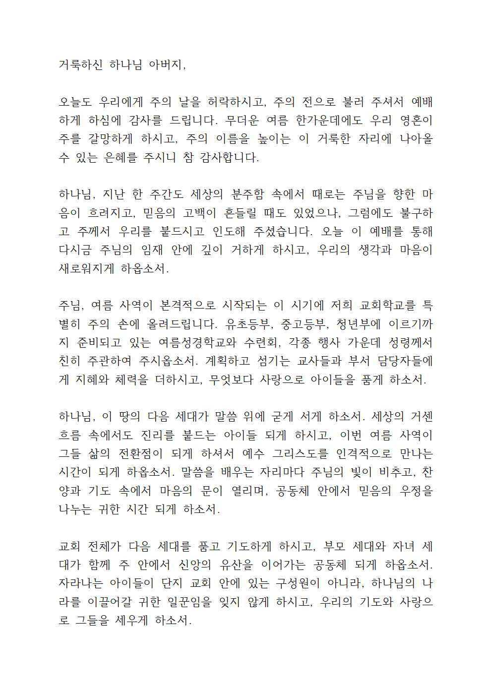 특히 교회학교의 여름성경학교와 수련회 일정 가운데 하나님의 특별한 은혜를 부어 주시고, 참여하는 모든 학생들이 말씀 가운데 살아계신 하나님을 인격적으로 만나며 믿음이 자라게 하옵소서. 준비하고 인도하는 교사들과 봉사자들에게도 성령의 지혜와 체력을 주셔서 사명을 잘 감당하게 하옵소서. 하나님 나라의 다음 세대들이 하나님의 말씀 위에 견고히 세워지게 하여 주옵소서.